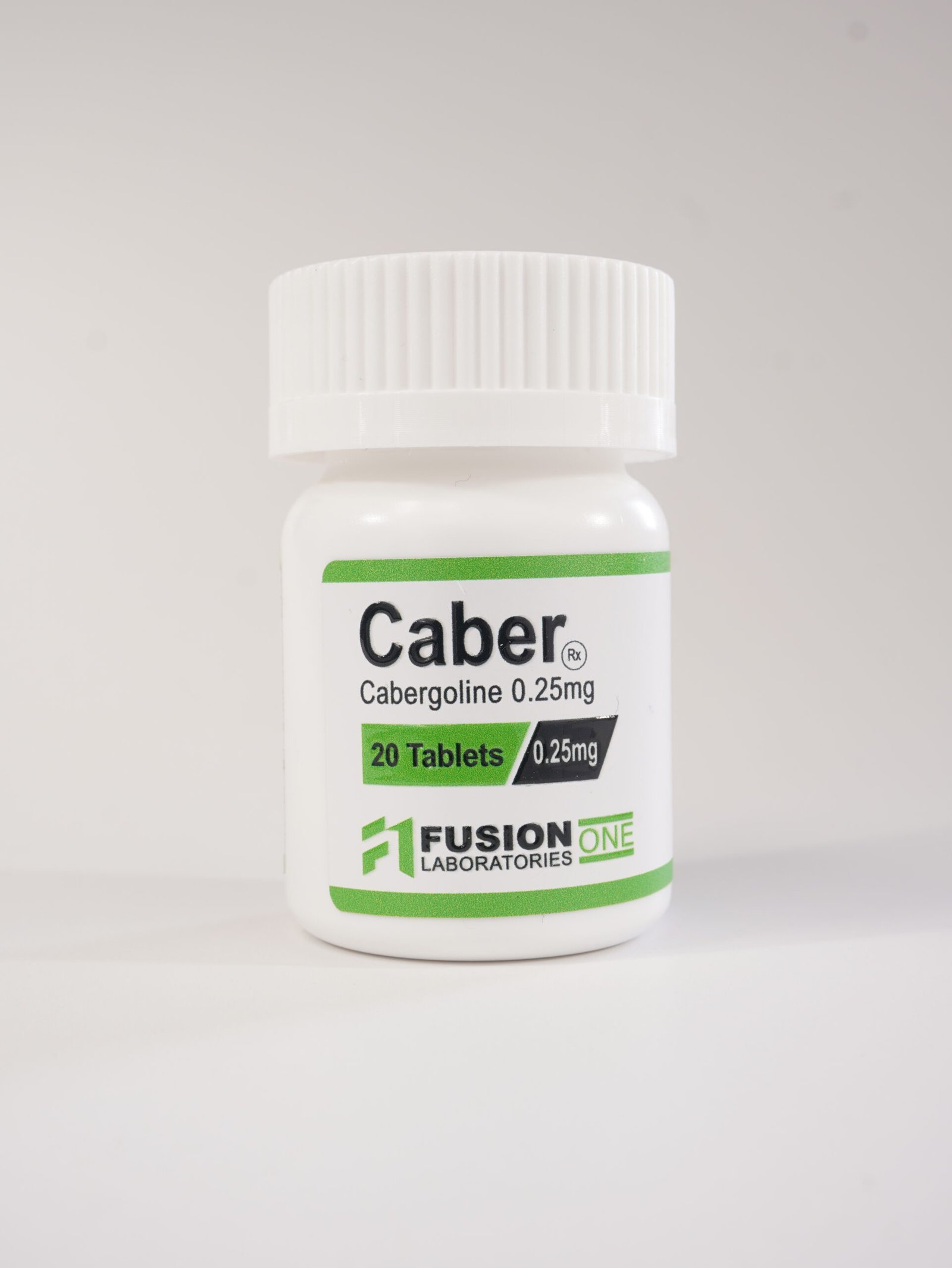 “Fusion One Laboratories Caber (Cabergoline) 0.25mg. A high-purity prolactin inhibitor and dopamine agonist. Each bottle contains 20 tablets. Ideal for hormonal management and PCT protocols.”